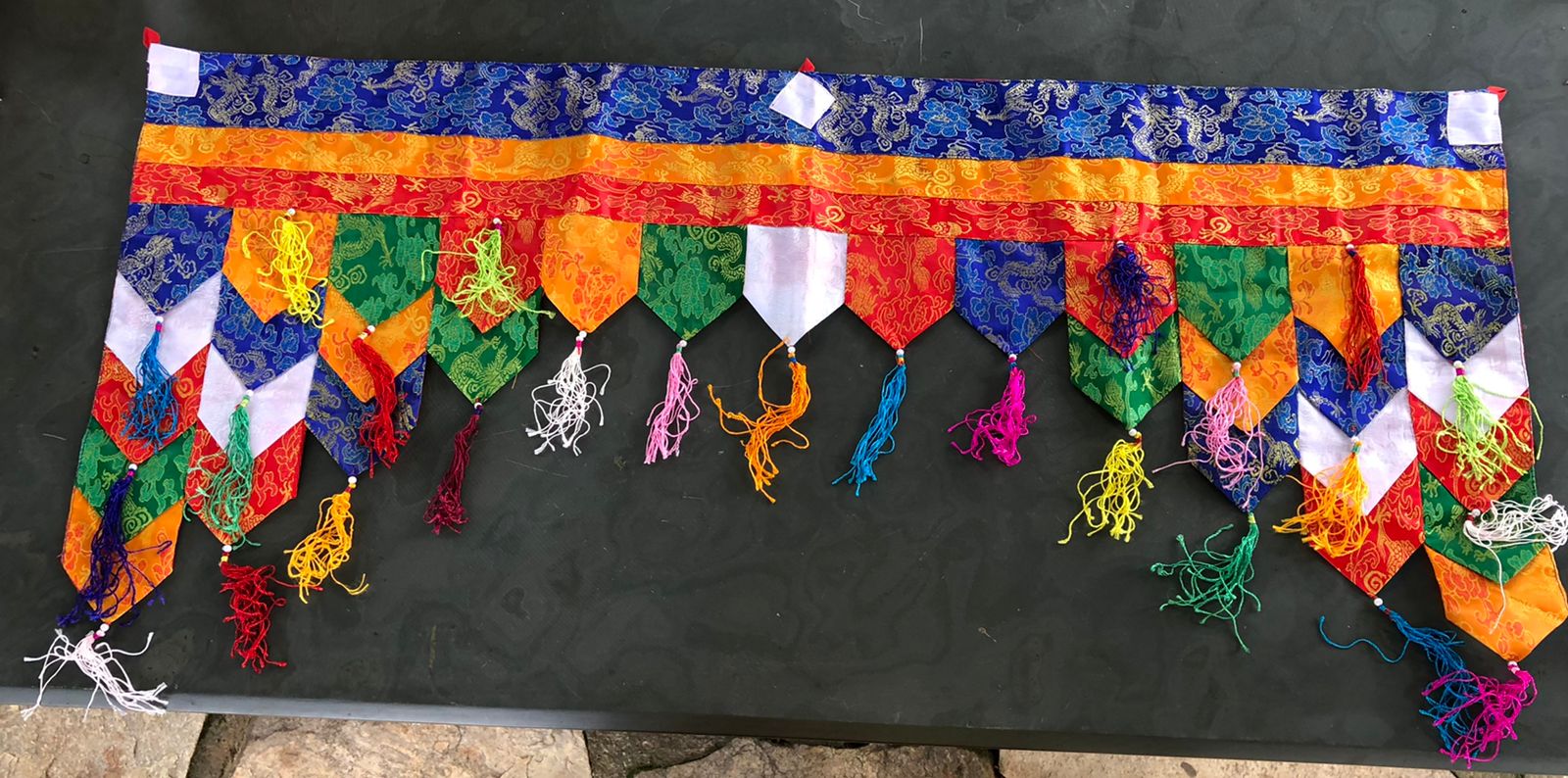 135) Enfeite para porta ou janela; tecido/brocado; R$120